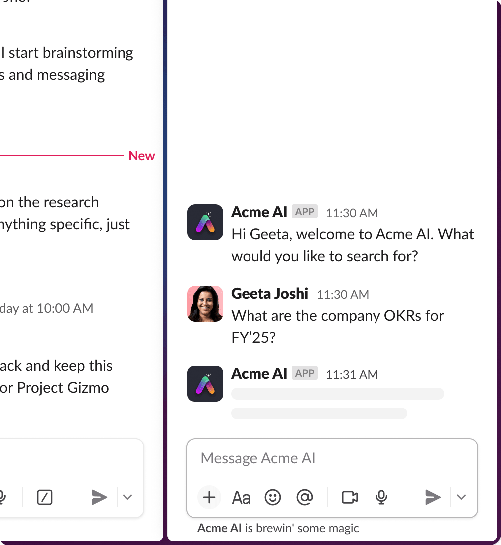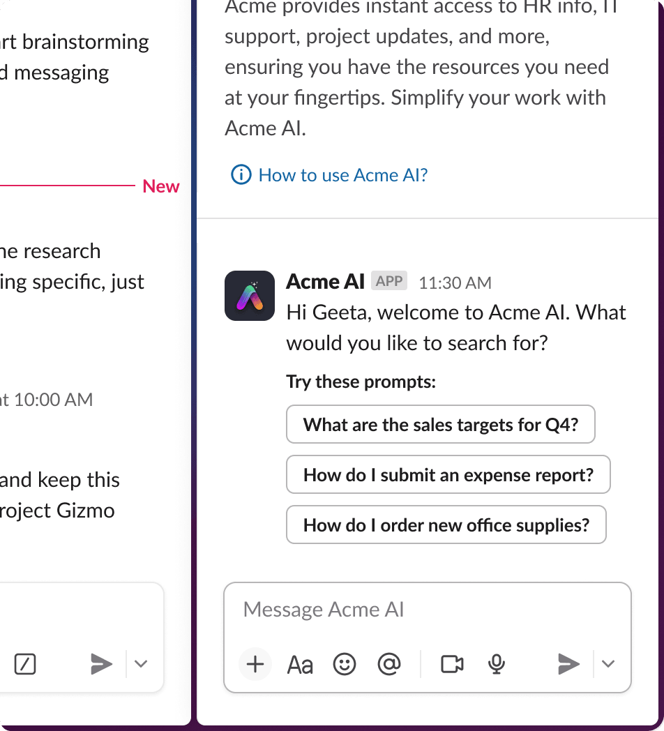Slack offers a unique messaging experience for agents, including a side-by-side window within the Slack client, an app launch point accessible from the top bar in Slack, special loading states, suggested prompts, and app threads. Slack does not provide an LLM; rather, it gives you the tools and interface to best integrate an LLM of your choice for use in Slack.